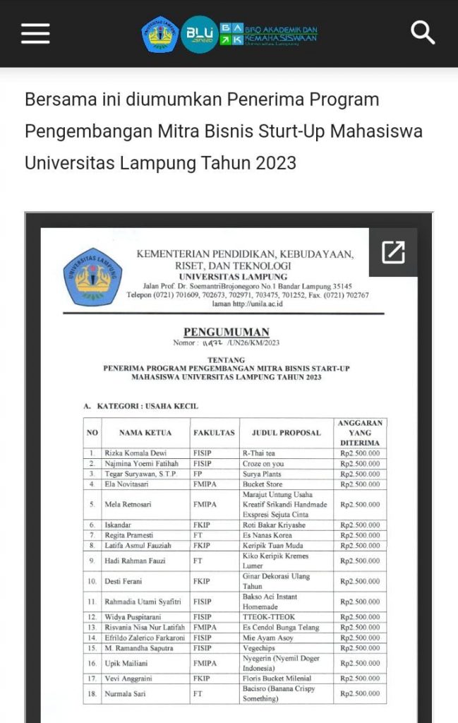 Enam tim mahasiswa Universitas Lampung tahun 2023, diketuai oleh Kerin Yolanda Clara, Doni Junanto, Padma Dewi Piranti, Dimas Prayoga, Dwi Ayu Sularsih, dan Rili Yunita, berhasil lolos dalam Program Pengembangan Mitra Bisnis Start-Up (PMBSUP) 2023.