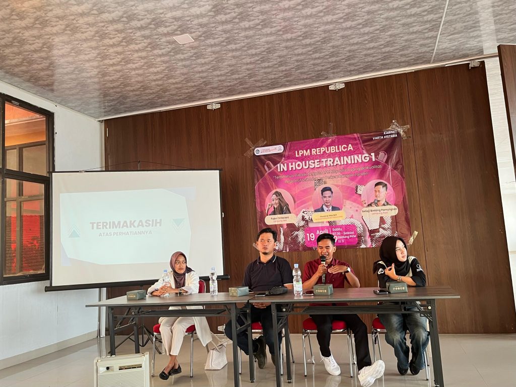Lembaga Pers Mahasiswa (LPM) Republica sukses menggelar In House Training (IHT) 1 bertema “Terbina Pribadi Anggota LPM Republica yang Berkualitas dan Responsif terhadap Isu Perkembangan Zaman”. Kegiatan ini berlangsung pada Sabtu, 19 April 2025, bertempat di Gedung PKM lantai 3 Fakultas Ilmu Sosial dan Ilmu Politik (FISIP), Universitas Lampung.