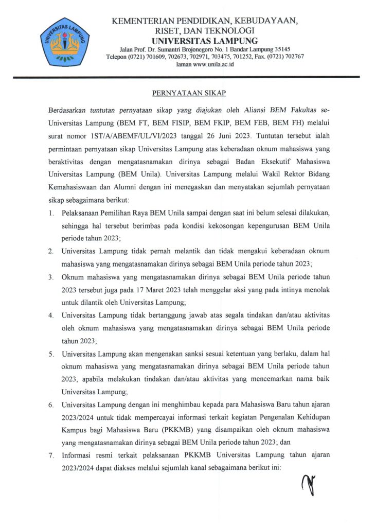 Universitas Lampung melalui Wakil Rektor Bidang Kemahasiswaan dan Alumni dengan ini menegaskan dan menyatakan sejumlah pernyataan sikap sebagaimana berikut: